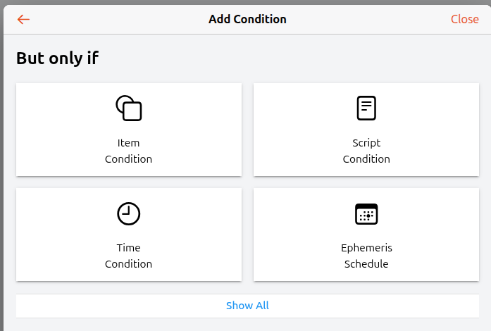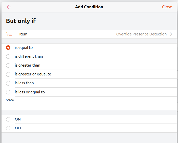 - I normally set a trigger with an Item that updates its state. I set any action and set some conditions always including one related with the trigger’s item having a value with an operator.