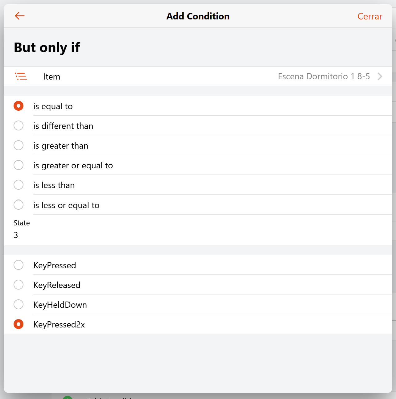I select the operator an the state, corresponding to the 5th button of the Remotec ZRC90, and the value 3 for the state “KeyPressed2x”
