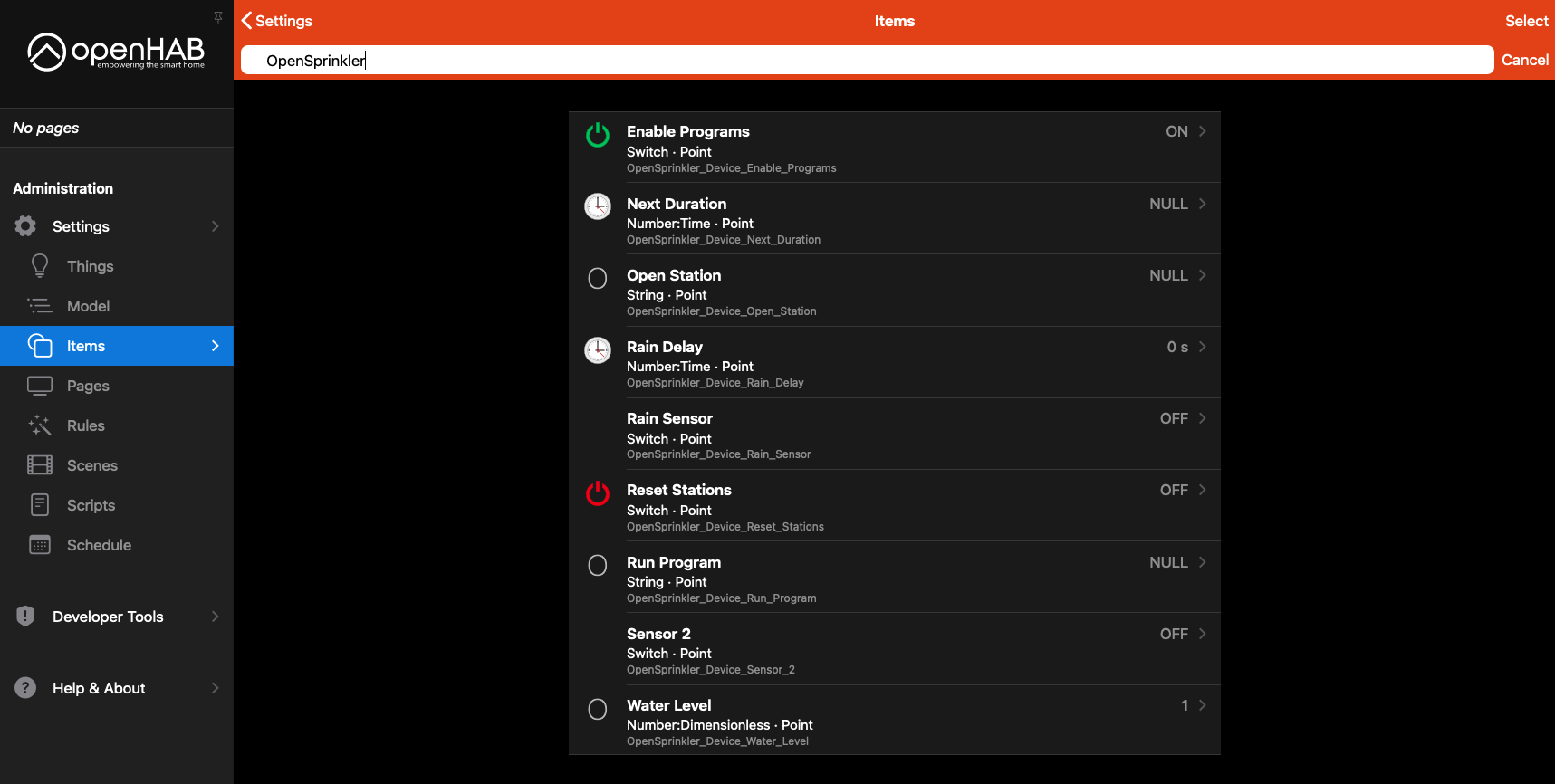 Running openHAB 4.0.4 and connected an OpenSprinkler Pi successfully using the OpenSprinkler binding. I created the bridge thing, then the device thing, and all the items on the channels of the device thing.