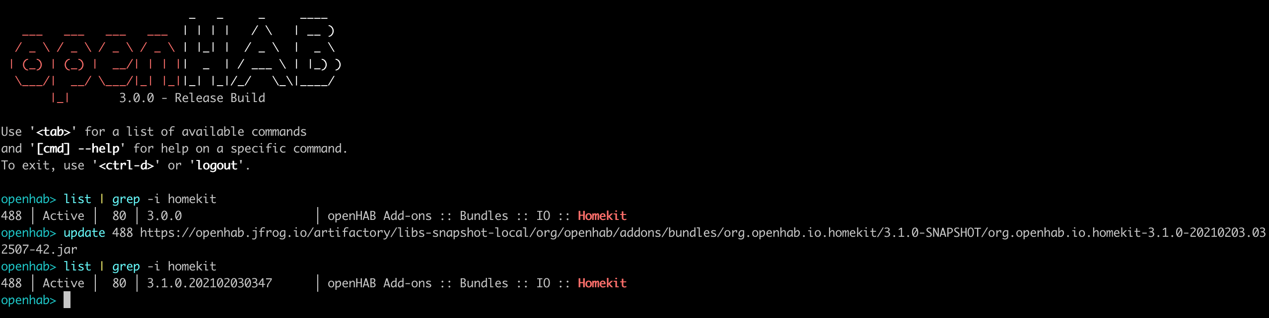 update <ID> https://openhab.jfrog.io/artifactory/libs-snapshot-local/org/openhab/addons/bundles/org.openhab.io.homekit/3.1.0-SNAPSHOT/org.openhab.io.homekit-3.1.0-20210203.032507-42.jar