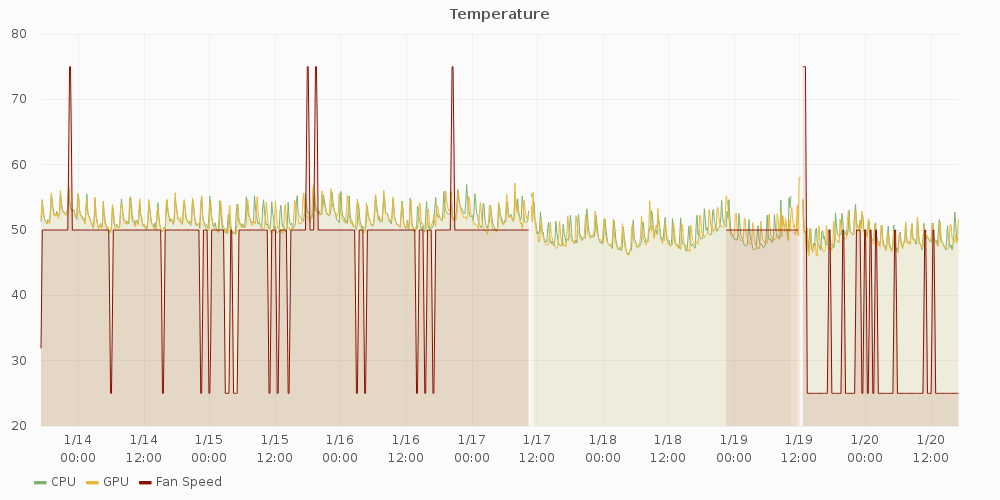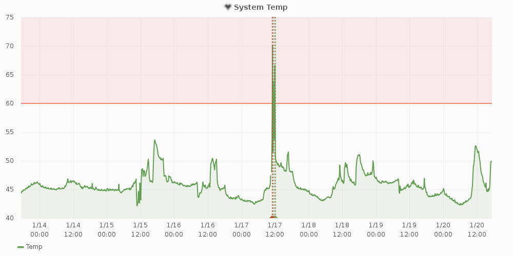 The Pi has a UPS hat on it with a variable speed fan, the break in the fan data was me tweaking settings and breaking things but the CPU/GPU values were consistent, the fan is controlled by a rule set so switch 25%, 50%, 75% or 100% depending on temp, the Pi lives in a cupboard near main fuse board and wireless router/Network patch panel and there is little natural air flow.