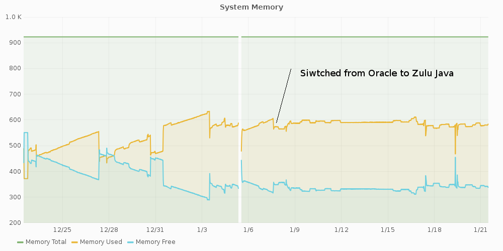 On a slightly separate and more positive note I did recently move from Oracle Java to Zulu “1.8.0_152-b76” and memory wise things have improved and I’m not seeing such a consistent upwards trend.