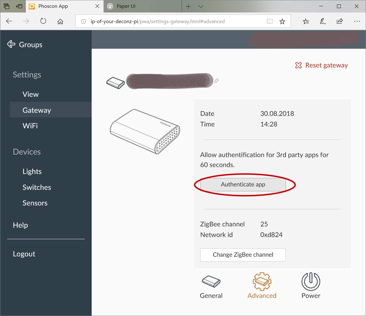 Before proceeding, go back to your Deconz window and click in the Gateway → Advanced configuration → Authenticate app. This does the same as pressing the connect button a real HUE bridge: