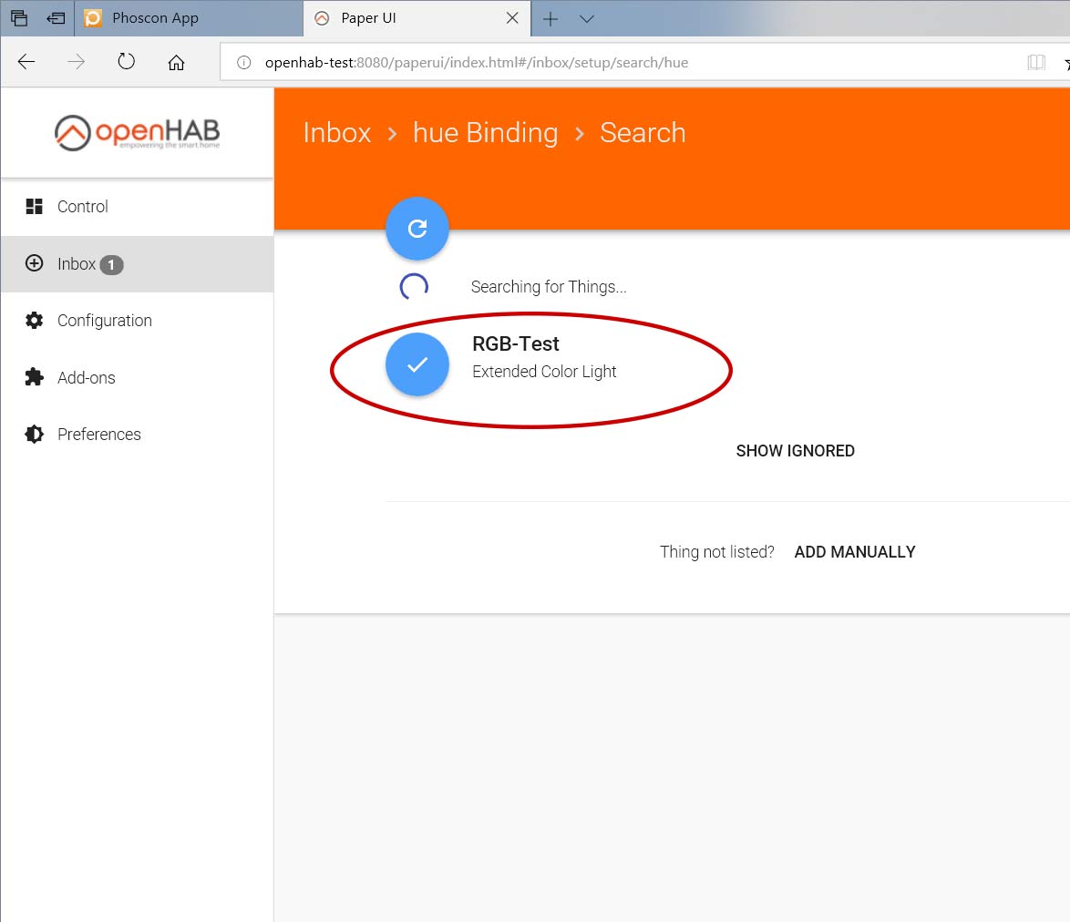 Install the HUE binding via the PaperUI and go to the inbox → “+” → HUE Binding → add manually: