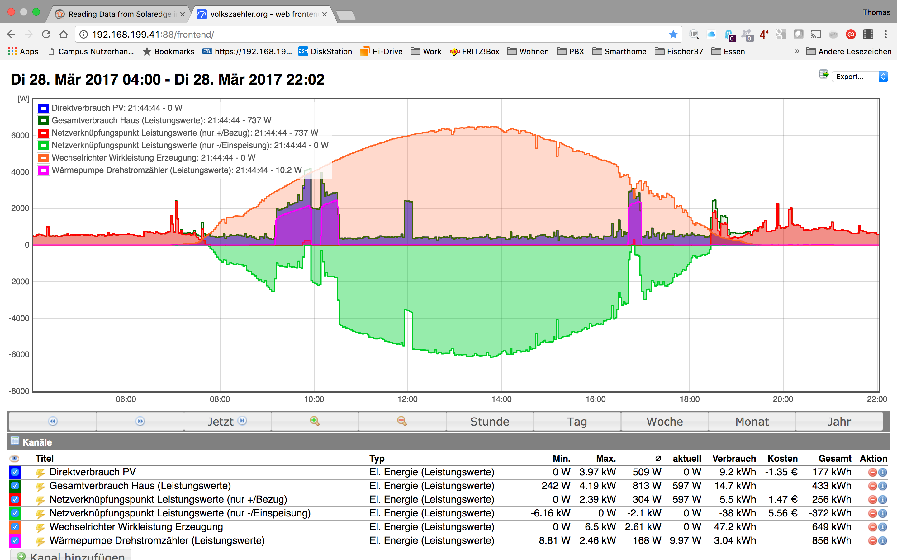 Here’s a nice graph of all the data that we have been reading (plus some derived values, such as the directly consumed energy in the house) from a really sunny day.