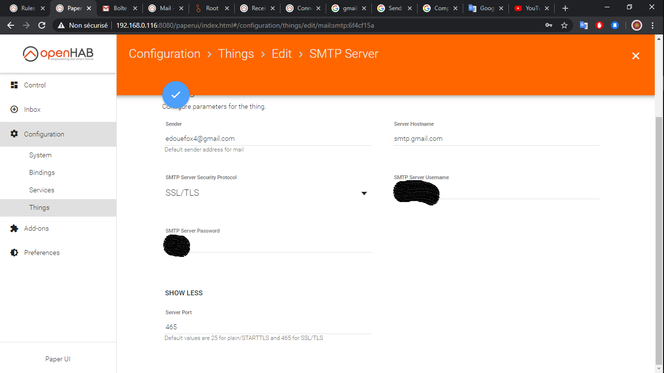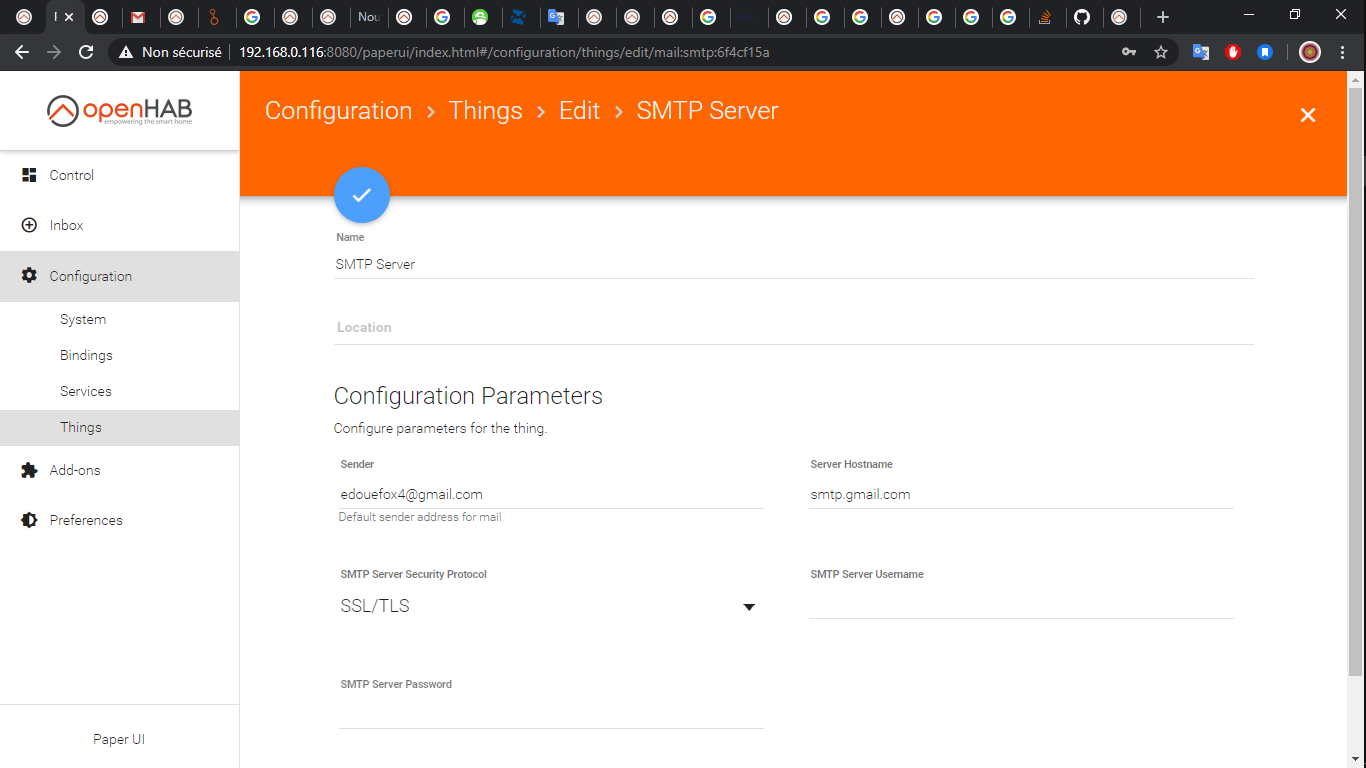 So if you want openHAB to be able to use your Gmail account, it needs to know the username and password, and you would have to tell openHAB what those are by filling in some boxes on a form. We can guess what those boxes might be named.