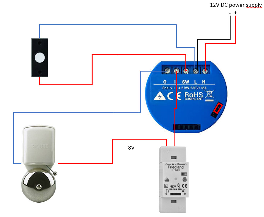 I used this wiring diagram as example. The Shelly is connected to a 12v DC adapter. The chime can run any voltage needed (not just the 8v shown in the picture).