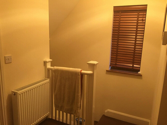 This is a dark hallway lit with just one of the dimmable white HUE bulbs, displaying quite a warm colour. (That device on the window seal is my zwave motion sensor, it turns on the light whenever motion is detected and the room is dark enough)