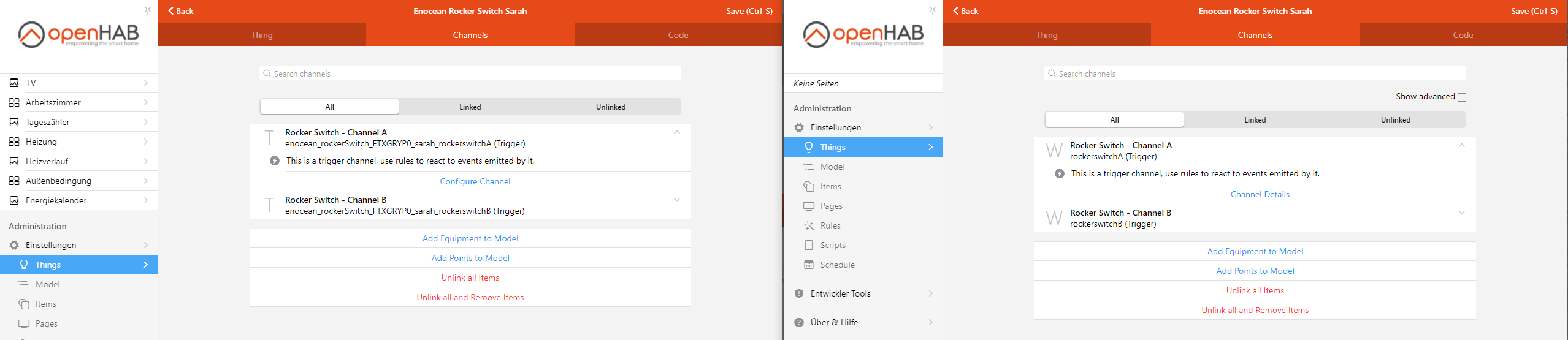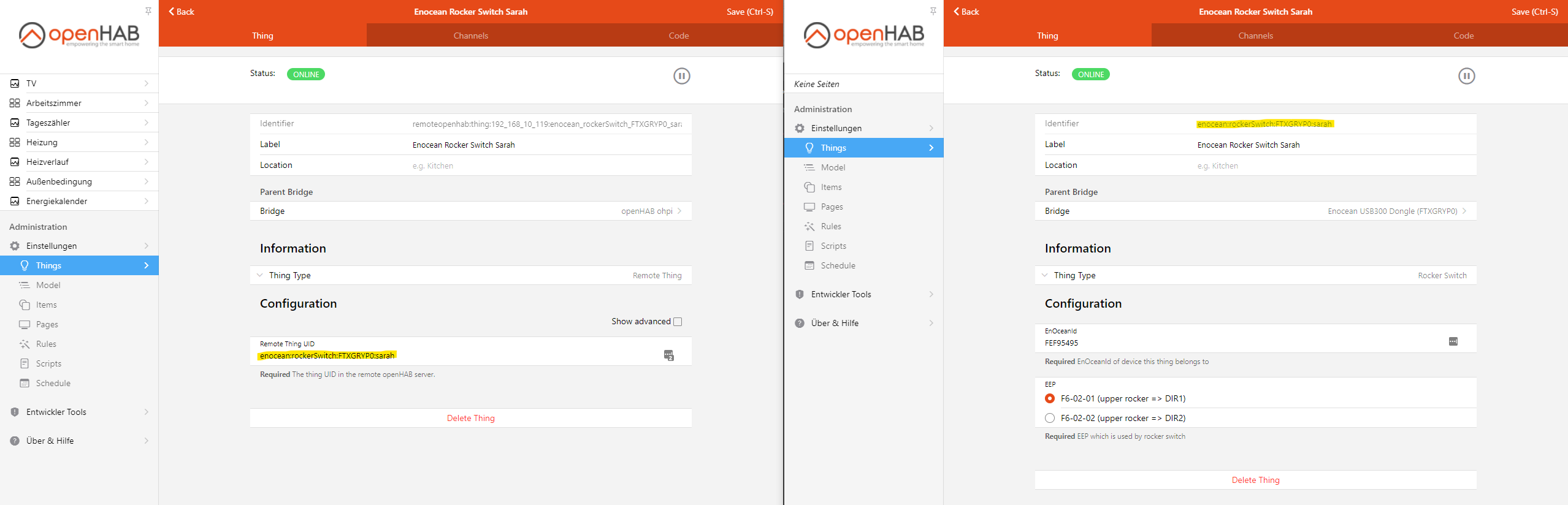 The enocean-rocker-switch-thing is shared and seems online in both machines.