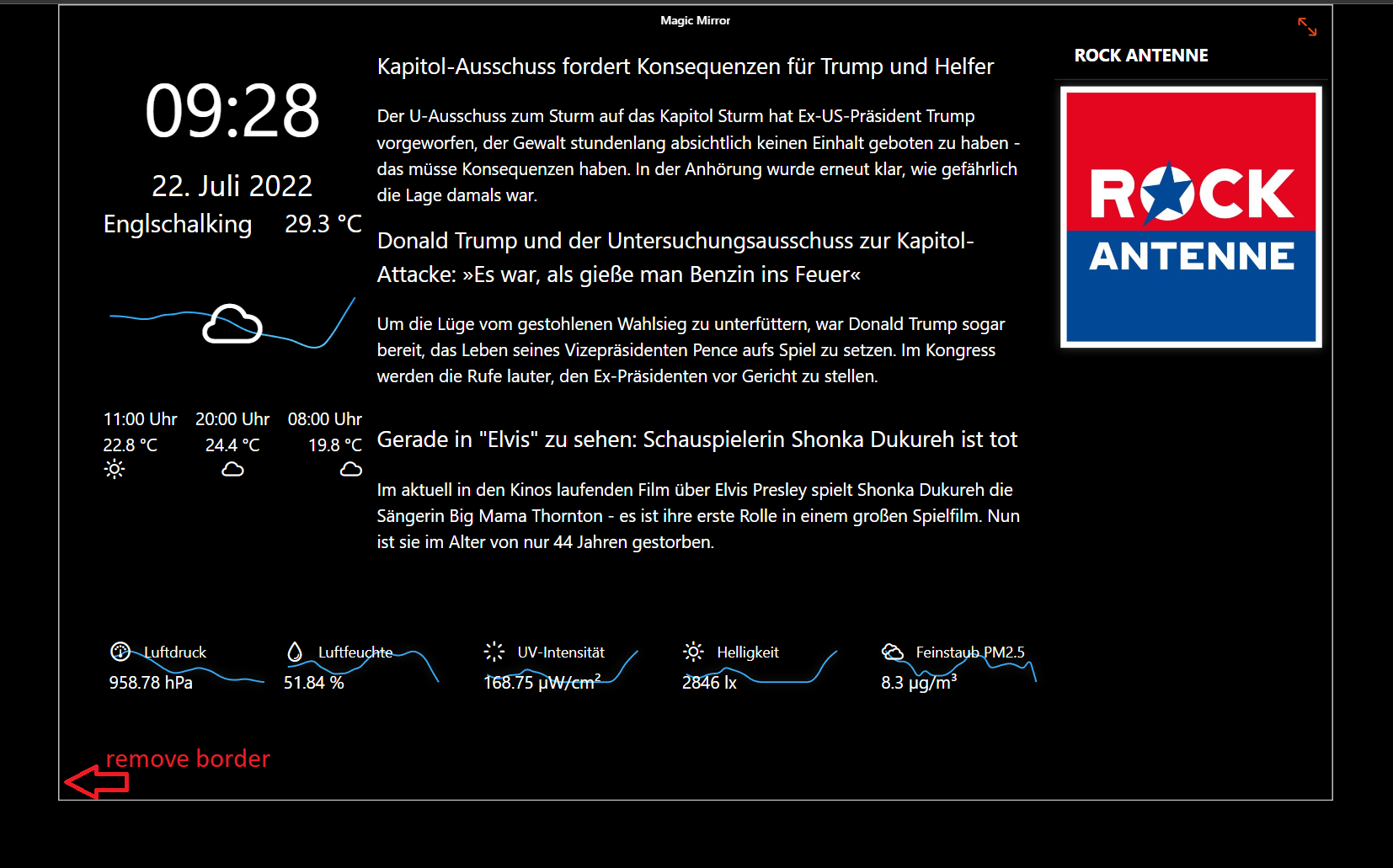 I use a fixed canvas page to fill a “magic mirror”. Unfortunately, a white border is created around the page. Is there a way to remove this?