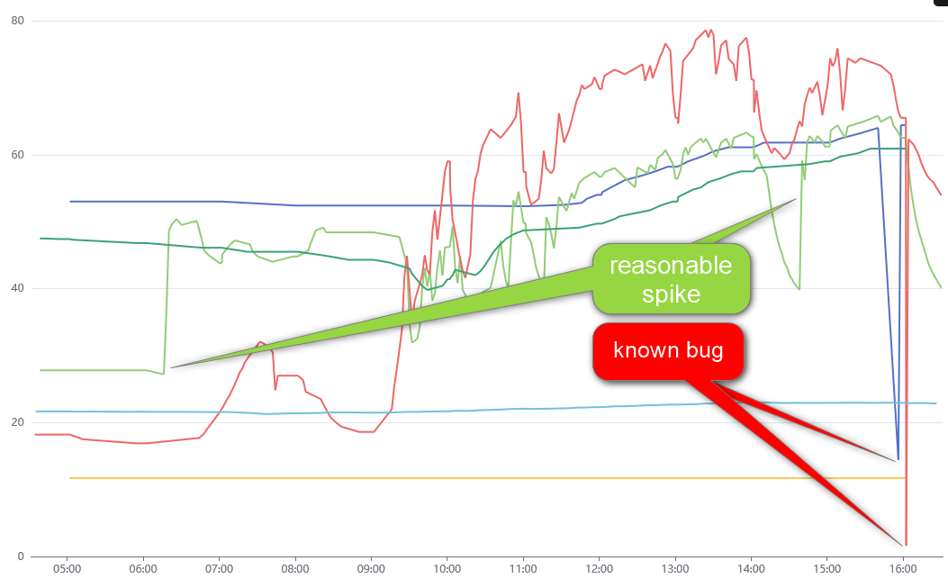 out-of-range doen’t quite fit, because the bug is sending sometimes random numbers, which unfortunately quite fit in the sensor’s range (as you can see, the blue line drops from 60-ish to 18 - which is still a “reachable” value for that sensor). I already drop “really” unrealistic values from getting sent in the first place within the python-script (e.g. >110°C for (compressed) water temperatures) or the likes. But thing is, they are “reachable”, yet it is an “unrealistic” drop from 62°C to 18°C and back to 63°C…