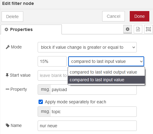 With 2.something version of node-Red, there was some improvements on this node, so you can now choose from “last input value” or “last valid output value”. So if I’m to combine rlkoshak’s approach with Node-Red, I now have implemented this one: