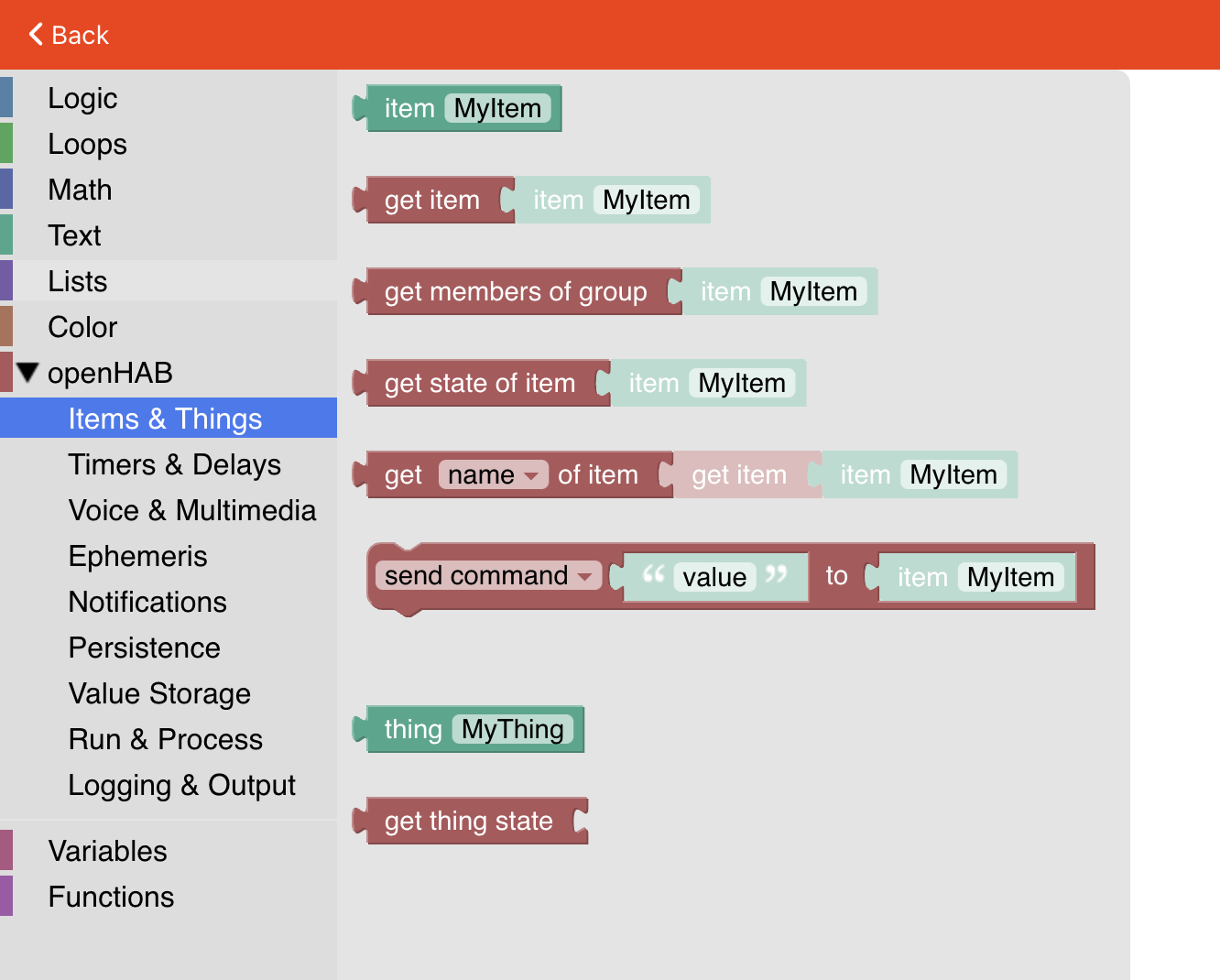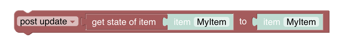 And one key thing to notice in the examples is that to get the state of an Item you use .state. You can’t just postUpdate a whole Item to another Item. An Item has a whole lot of other stuff associated with it too. But only the state can be sent as an update.