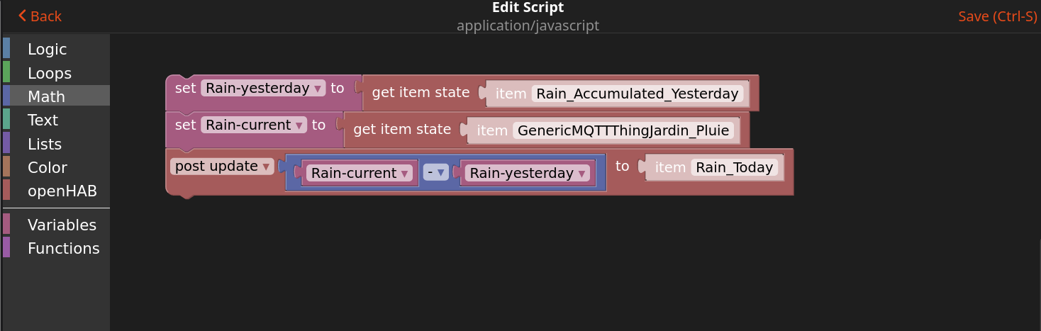 You need to store something in “memory”. But that value needs to persist across OH restarts. The best way to do that is by using an Item. Let’s make it a Number Item and call it “Rain_Accumulated_Yesterday”. If you are using a default OH 3 configuration, the state of this Item will be saved and restored by default.