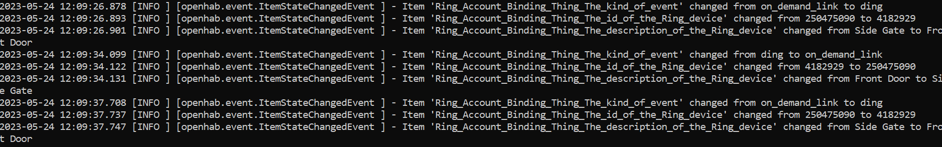 However, Iām not sure if this is somehow causing a conflict in the Binding. My Event timestamp updates correctly, but after the Event changes to ādingā from the Doorbell being rung, every several seconds the Event alternates from ādingā to āon_demand_linkā and back again - without the Event timestamp changing. It looks like the OpenHAB Item for the Event is alternating between the two without a new Event timestamp?