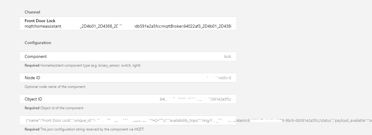 {"name":"Front Door Lock","unique_id":"xxxxxxxx-db591e2a5fcc","availability_topic":"ring/xxxxx/alarm/xxxxx-9bc9-db591e2a5fcc/status","payload_available":"online","payload_not_available":"offline","state_topic":"ring/xxxxx/alarm/xxxxxb591e2a5fcc/lock/state","command_topic":"ring/xxxxx/alarm/xxxxx9-db591e2a5fcc/lock/command","device":{"ids":["xxxxxc9-db591e2a5fcc"],"name":"Front Door Lock","mf":"Kwikset","mdl":"Lock"}}