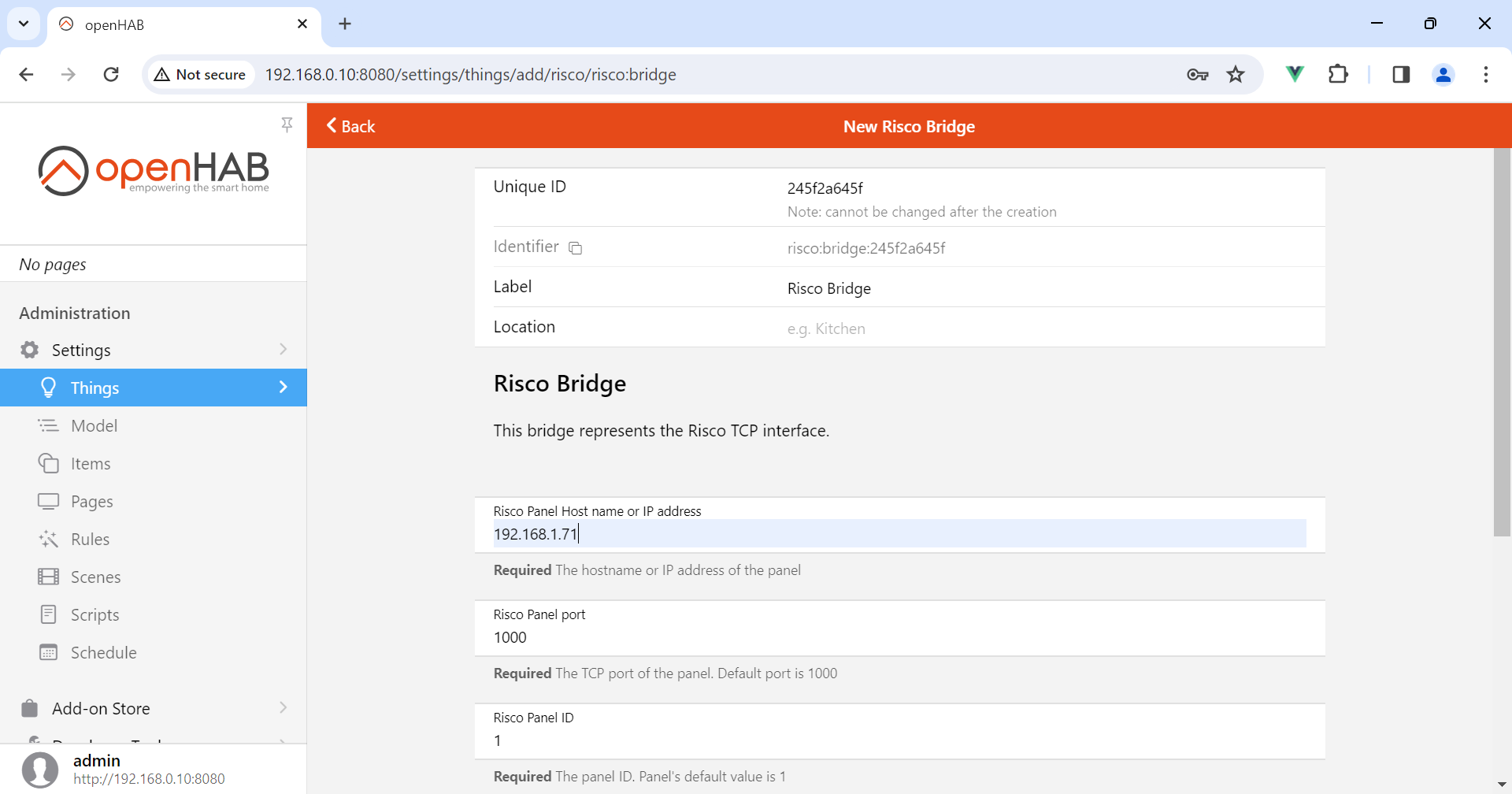 2024-02-18 13:37:26.007 [DEBUG] [internal.handler.RiscoHandlerFactory] - bundle org.openhab.binding.risco:4.1.0.202310291653 (280)[org.openhab.binding.risco.internal.handler.RiscoHandlerFactory(380)] : ActivateInternal