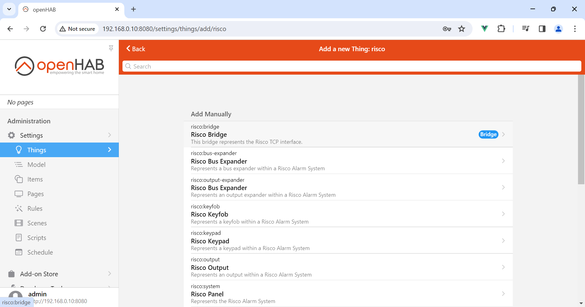 2024-02-18 13:37:26.008 [DEBUG] [internal.handler.RiscoHandlerFactory] - bundle org.openhab.binding.risco:4.1.0.202310291653 (280)[org.openhab.binding.risco.internal.handler.RiscoHandlerFactory(380)] : registration change queue [registered]