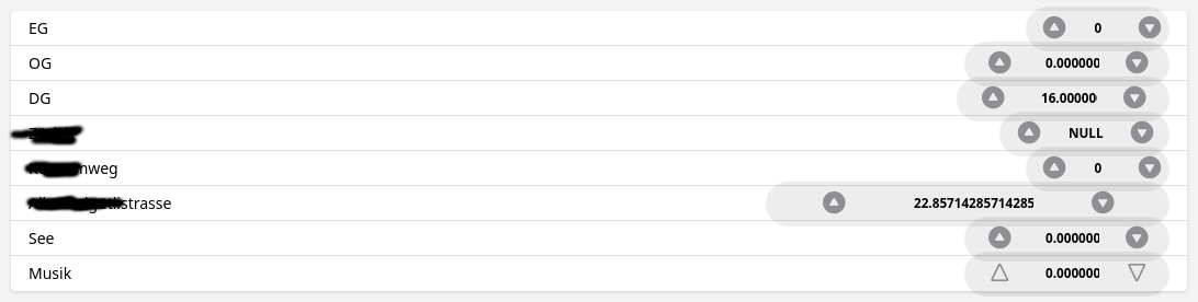 I defined a group of rollershutters, set its state description to %.1f and set state-in-center to on. Now the group item’s state is shown as expected (e.g. 37.5, in Edit Item view), in Item list it’s shown as 37.500000000000, and between the arrow up/down-buttons its shown as 37.50000.