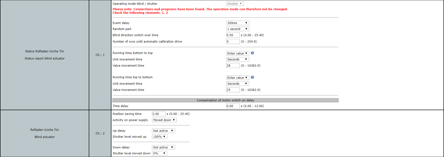 The HmIPW-DRBL4 supports four rollershutter/blinds. For each the Homematic UI is showing two channels (1+2, 5+6, 9+10, 13+14). One is called “Status report blind actuator” the other “Blind actuator”. Those look like this: