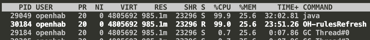 For completeness: My installation is working now (at least for the time being). Itās a relatively large setup with close to 1000 items and almost 10k lines of rules in DSL code. I do not see excessive CPU usage, but I do see the huge memory footprint mentioned in this thread. In my case itās 8.4G of virtual process size (on a 64 bit Ubuntu x86 machine, Zulu 17 JRE).