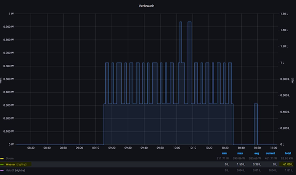 Today I noticed that our toilet cistern is leaking and it wasted ~60l for a short period of time, visible in Grafana: