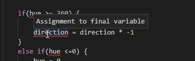 The third error is because direction is defined as a val instead of a var and we are trying to change a val. It should be a var. Of course, once we do that we will get the same error we got with the hue variable.