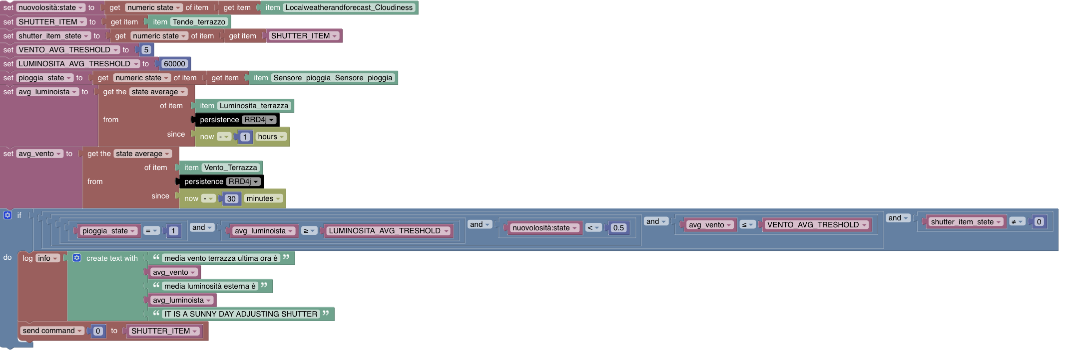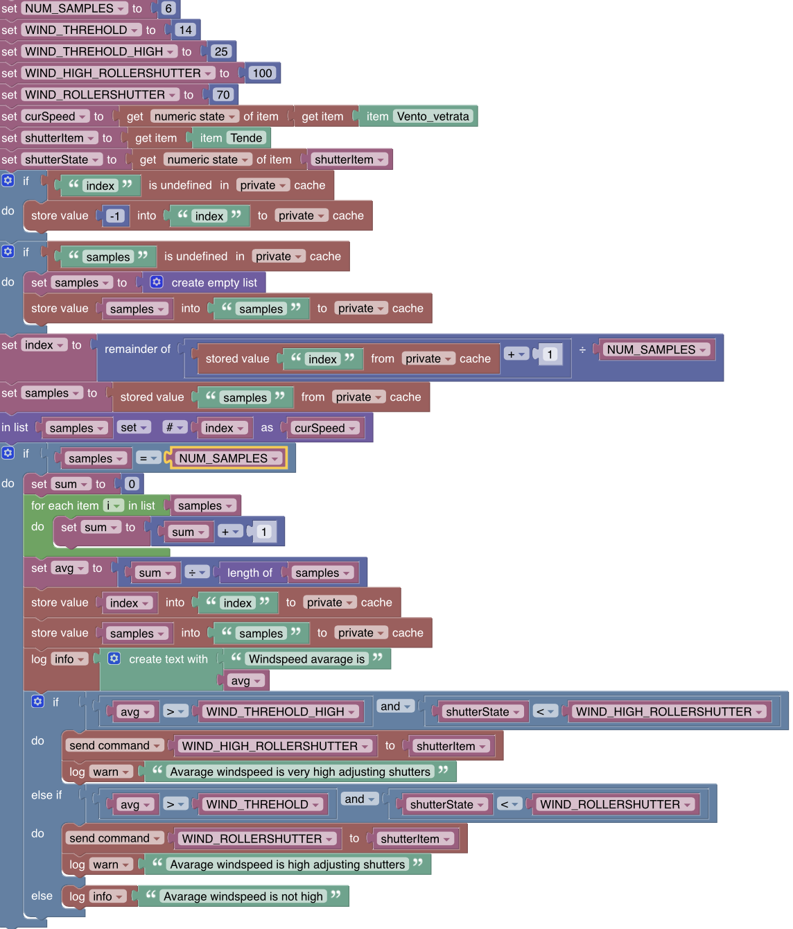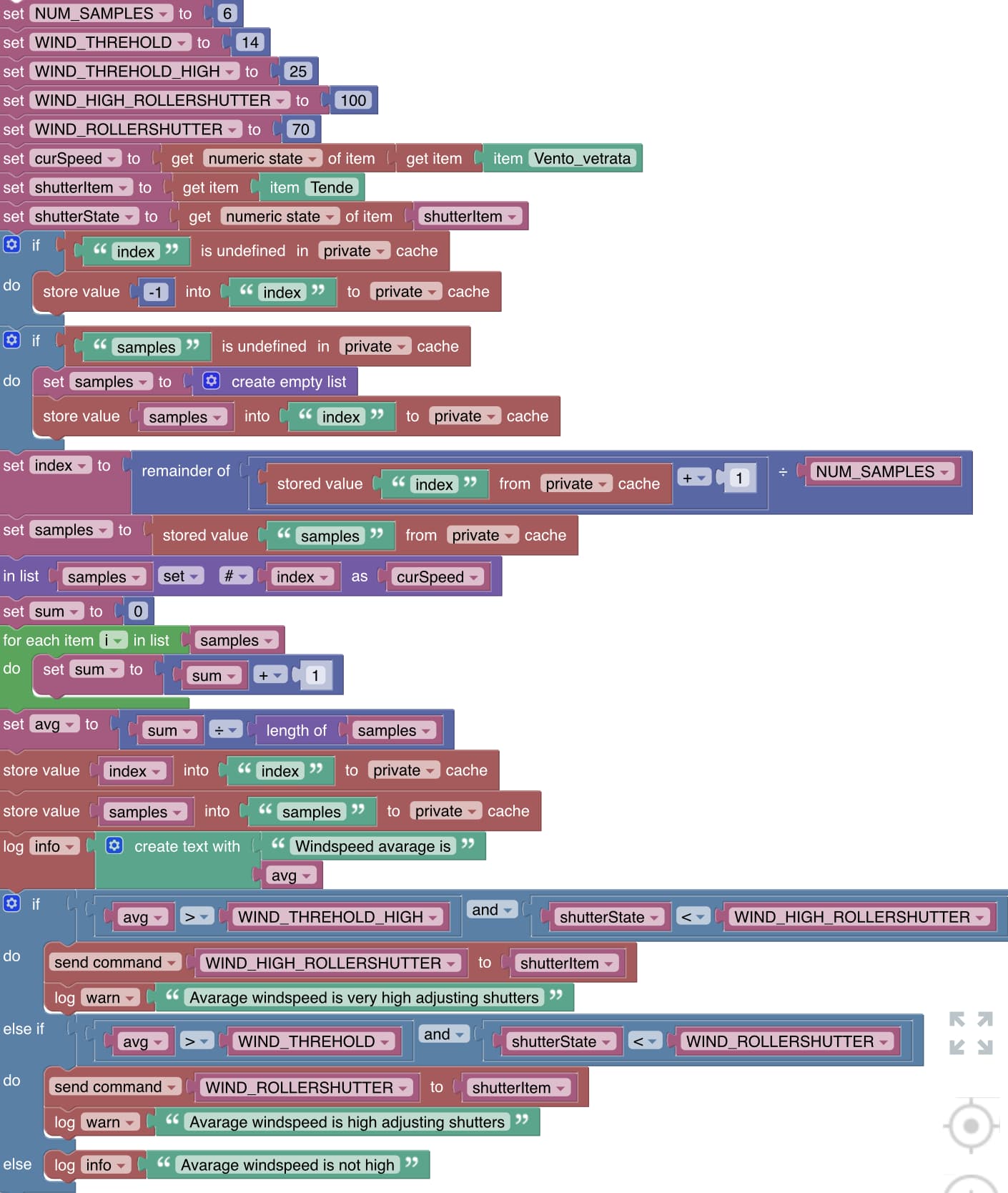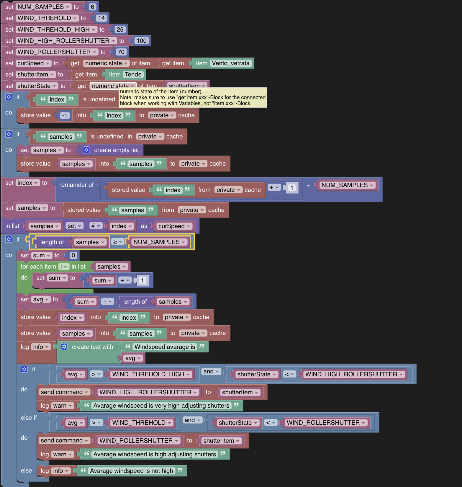 But let’s say you want to be super efficient for the practice. You could add another rule that triggers when the rollershutter changes. You can add a Blockly script action here that tests to see if the rollershutter is > 10 or not. If it’s less than 10 we don’t care what the windspeed is so disable the cron triggered rule (there’s a block for that). If it’s greater than or equal to 10 enable the cron triggered rule. Then the rule will only be calculating the windspeed average when it matters.