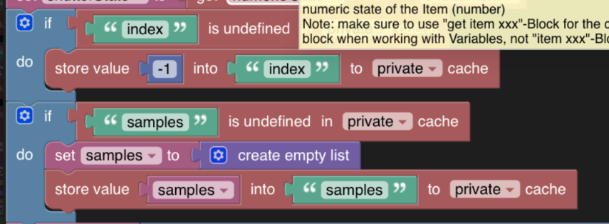 The first time the rule runs there won’t be any value stored int eh cache for “index” so we initialize it to -1. There won’t be the “samples” list either so we create an empty list and store that in the private cache. That’s what these blocks do: