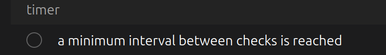 Say you have triggers that can occur as often as every second, but you only want to run your rule every 60 seconds at most, and not any more often than that. In this case you would set the minimum interval to 60 seconds and it will ignore triggers until 60 seconds have passed since the last rule run.
