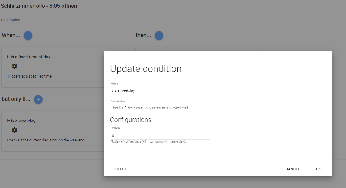 2019-12-19 13:07:58.457 [.event.RuleStatusInfoEvent] - 7fe69863-034f-4932-8417-312dce0235e0 updated: UNINITIALIZED (HANDLER_INITIALIZING_ERROR): Getting handler ‘ephemeris.WeekdayCondition’ for module ‘5’ failed: Config parameter ‘offset’ is missing in the configuration of module ‘5’.