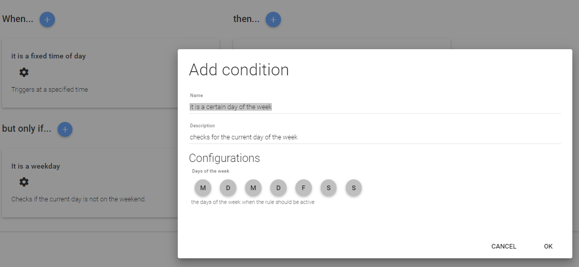 2019-12-19 11:49:16.797 [.event.RuleStatusInfoEvent] - 7fe69863-034f-4932-8417-312dce0235e0 updated: UNINITIALIZED (HANDLER_INITIALIZING_ERROR): Getting handler ‘ephemeris.WeekdayCondition’ for module ‘3’ failed: Config parameter ‘offset’ is missing in the configuration of module ‘3’.