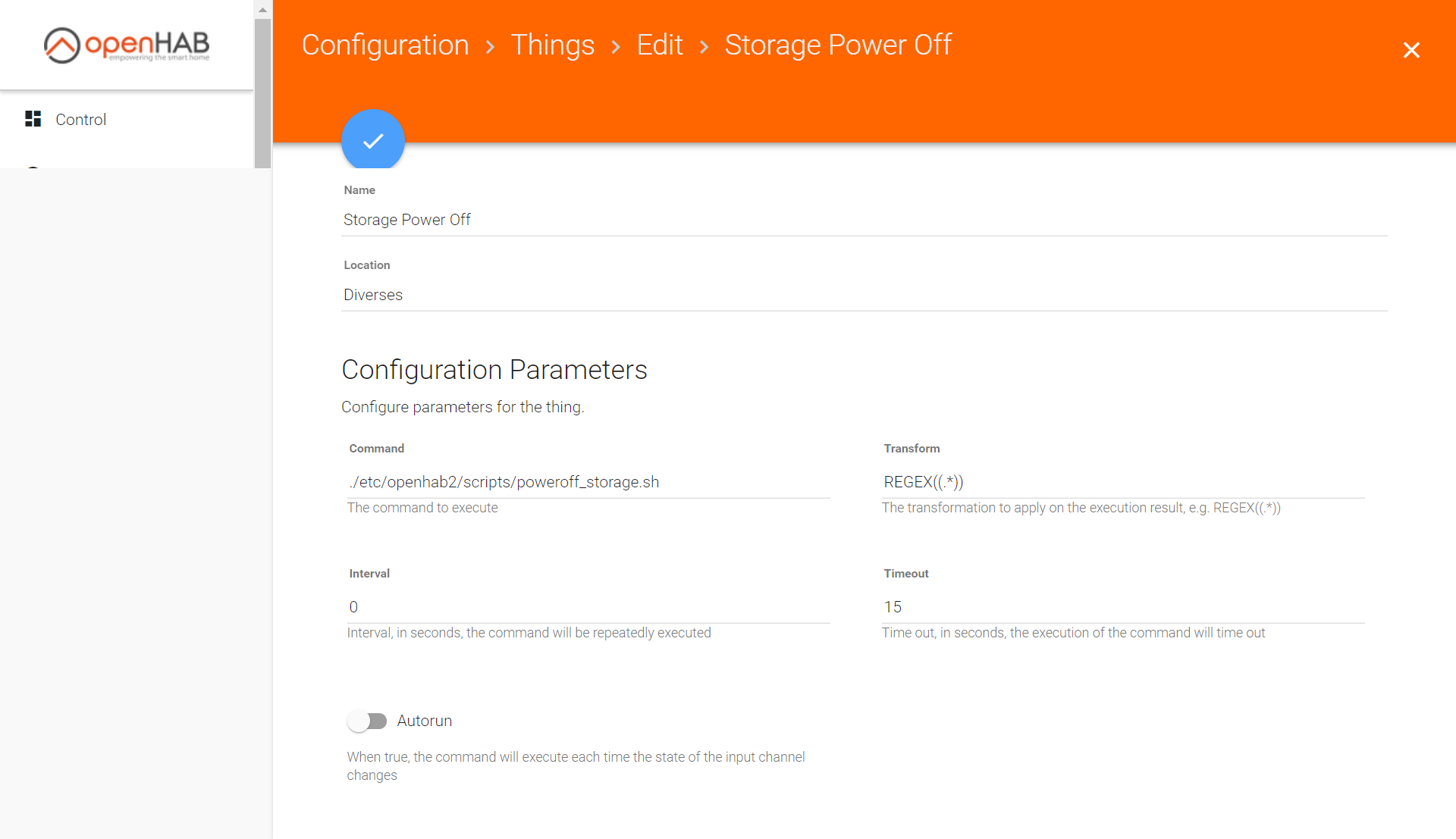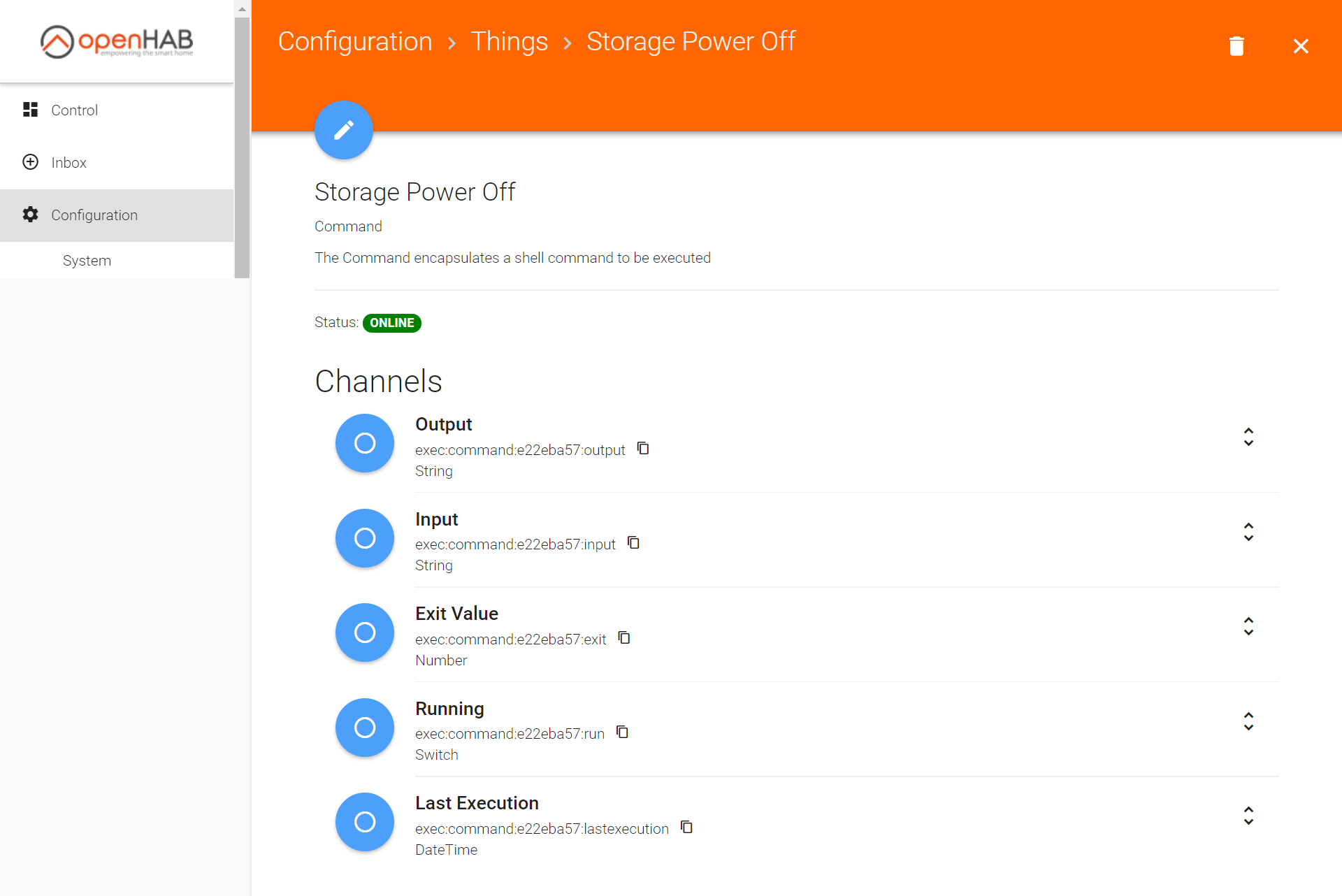 Thing exec:command:storage_power_off “Storage Power Off” [command=“/etc/openhab2/scripts/storage_poweroff.sh”, interval=0, timeout=15, autorun=false]