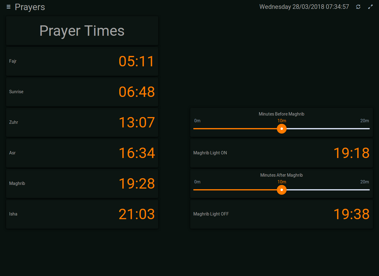 At every prayer time, for example, the adhan gets player on speakers, the tv pauses and display an image. Before and after Maghrib, the lights get turned on and off…