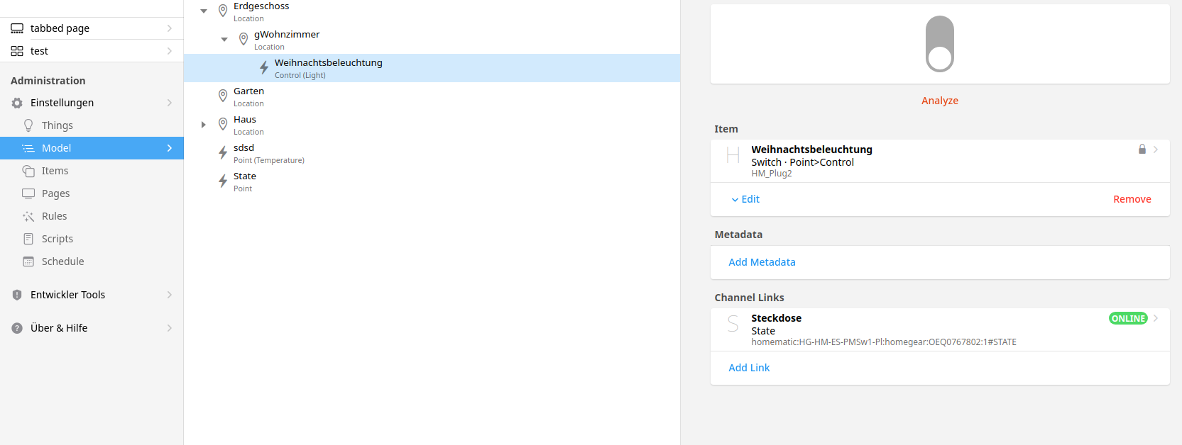 So the switch HM_Plug2 is now part of the Semantic Model. Important: it needs a “semantic class” the ["Light"] in my case in addition to the group, also the group needs a semantic class. in my case "Location"]