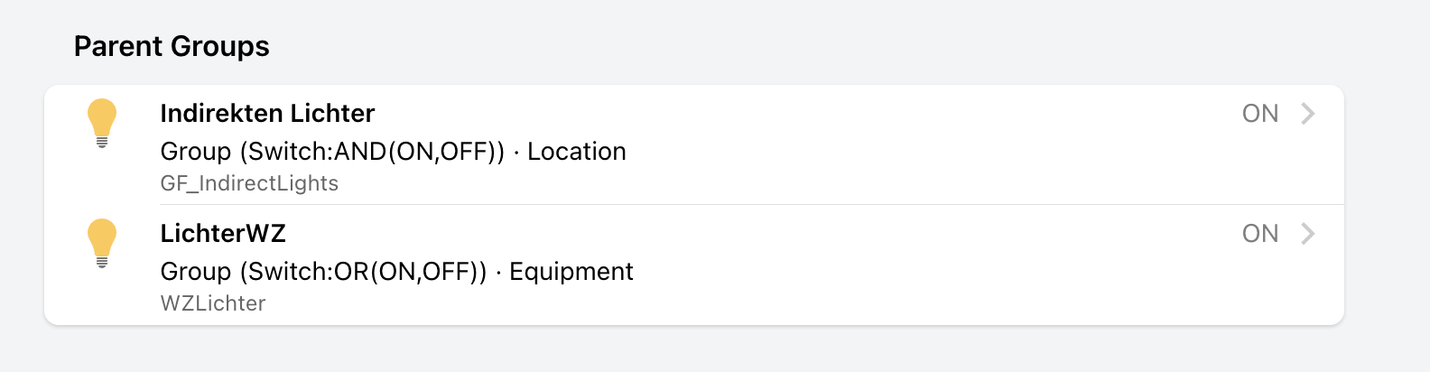 To me this is a pretty helpful structure as the item (in this case a light) belongs to the Wohnzimmer (living room) and it is also part of the Indirect Lights, which allows me to send ON/OFF to these groups separately. So, would be the solution to remove “Location” (I tried “equipment” first but it reveals the same problem) from the indirect lights?