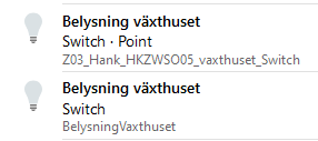 In some part of my house the only automation I have is light switches. That means in those parts I get lots of equipments that only have one point each, which I don’t think go well with the interface in the location tab. Either I go with the default and let all my points be named “switch”, which mean a long list where every other row just says “switch”. Or I name my points after what lamp they control, but it isn’t much better, see attached image.