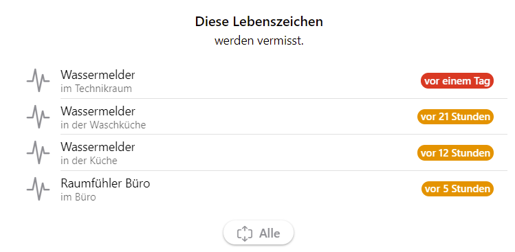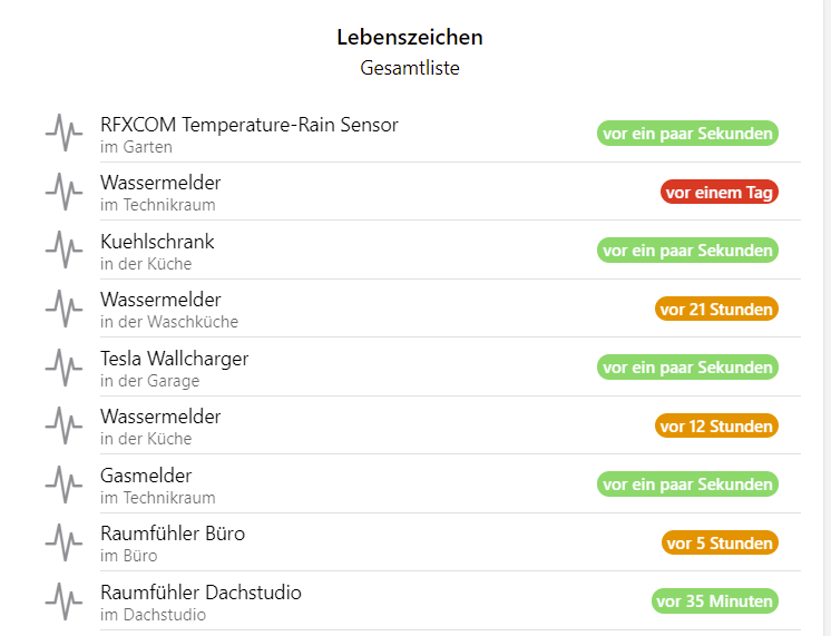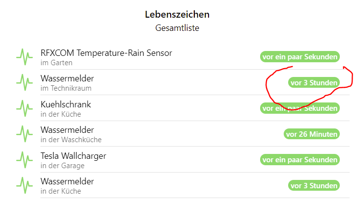 Notice the Shelly Flood “Wassermelder im Technikraum”. This guy was marked orange formerly. BUT: Since it is absolutely fine, if it sleeps for a whole day if no water alarm is to be issued, the widget should not complain about it…