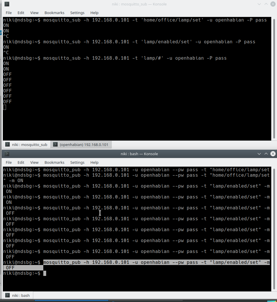 And my question is: How can i send command (message topic) from outside - terminal in linux, my own android app or other raspberry pi or arduino nano or D1 mini