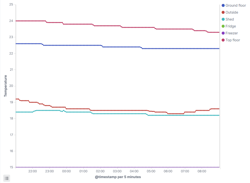 but the ‘dissect’ section converts the log line into individual elements, and we can change the type of those in Kibana so that we can plot them. It’s cheap and cheerful and I’m lucky that the RFXcom binding logs just the thing I need, but it works! I’m also not doing anything special with timestamps, just using the time the message is seen.