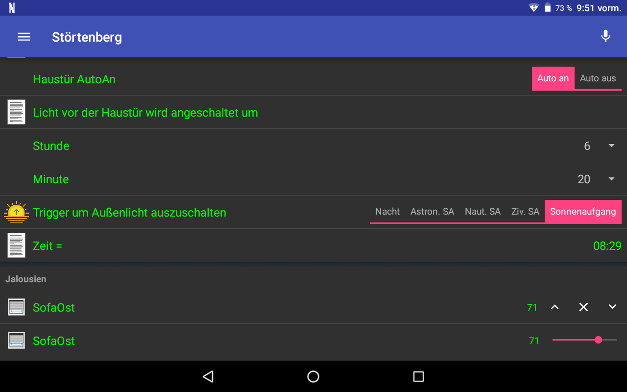 Switch item=FrontDoorLightOffTrigger labelcolor=["lime"] mappings=["NIGHT"="Nacht", "ASTRO_DAWN"="Astron. SA", "NAUTIC_DAWN"="Naut. SA", "CIVIL_DAWN"="Ziv. SA", "SUN_RISE"="Sonnenaufgang"] visibility=[FrontDoorLightAutoOn==ON]