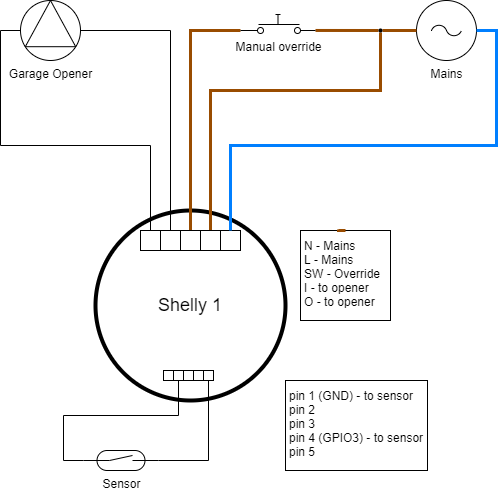 One other thing that was a bit tricky was the state of the GPIO pins at boot. The Shelly has three pins available (GPIO0, GPIO1 and GPIO3), but only GPIO3 could be kept low at boot – if the others two were low, it would not boot correctly. As the sensor switch could be either high or low at boot depending on if the door would be open or not – this meant that only GPIO3 was available if I wanted to have a system that would safely handle a reset / power loss.