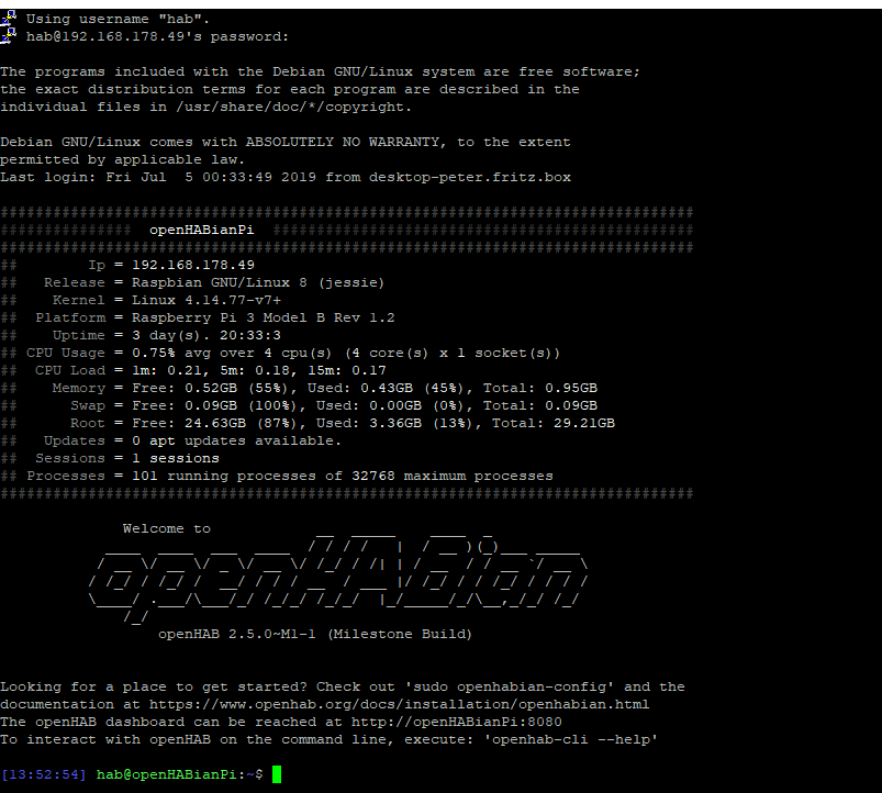 How does the screen look like, when you’re open your ssh-connection (Putty). Does it look like this?: