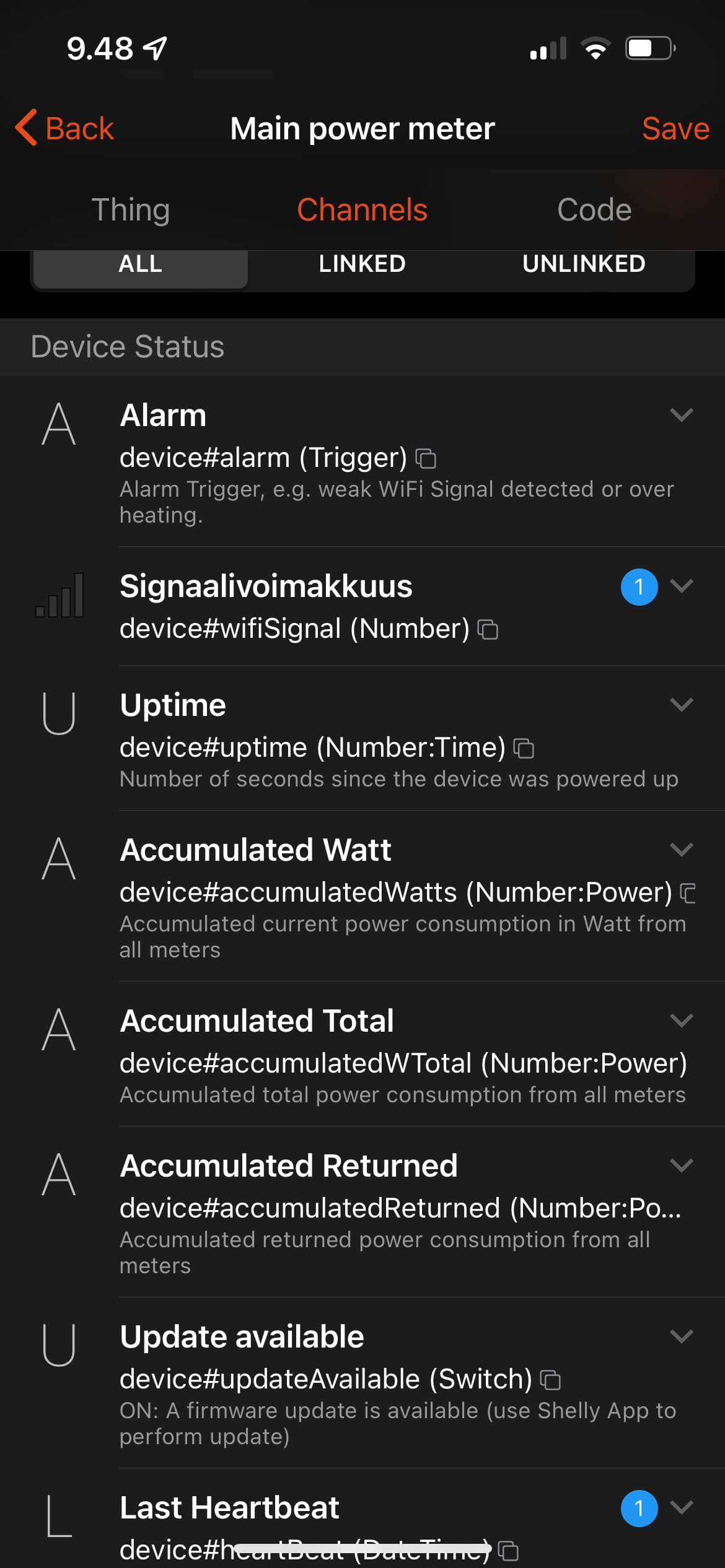 - thing does not expose the channels for phase A, B and C, as advertised in the docs. There is only the “device” channel group but no “meter1” channel group for example. Shelly - Bindings | openHAB