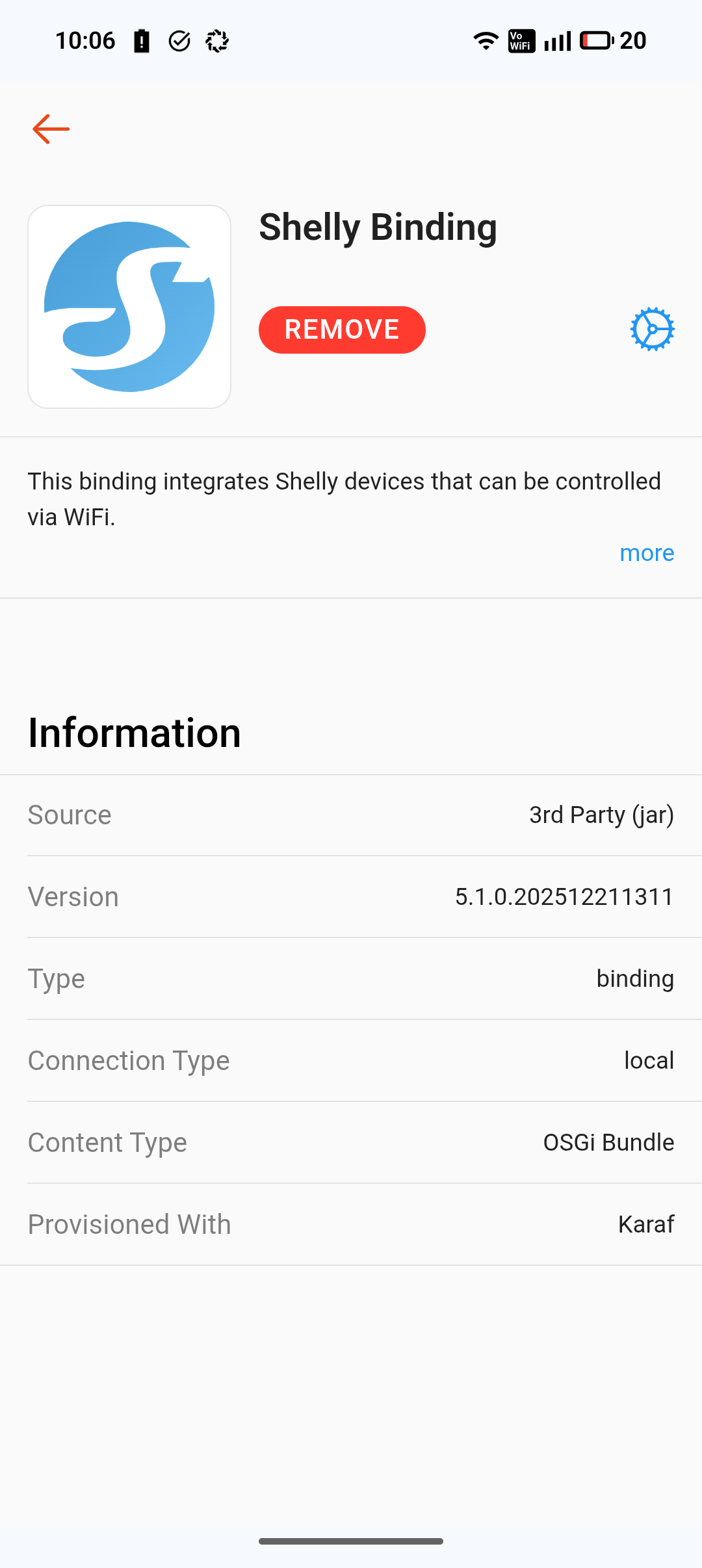 2025-12-23 11:57:25.284 [TRACE] [shelly.internal.api.ShellyHttpClient - 498 ] - shellyplusplugs-c82e180a06cc: HTTP Response 200: {"id":1011900206,"src":"shellyplusplugs-c82e180a06cc","dst":"openhab-","result":{"ble":{"enable":true,"rpc":{"enable":true}},"cloud":{"enable":true,"server":"shelly-146-eu.shelly.cloud:6022/jrpc"},"mqtt":{"enable":false,"server":null,"client_id":"shellyplusplugs-c82e180a06cc","user":null,"ssl_ca":null,"topic_prefix":"shellyplusplugs-c82e180a06cc","rpc_ntf":true,"status_ntf":false,"use_client_cert":false,"enable_rpc":true,"enable_control":true},"plugs_ui":{"leds":{"mode":"off","colors":{"switch:0":{"on":{"rgb":[0.000,100.000,0.000],"brightness":100.000},"off":{"rgb":[100.000,0.000,0.000],"brightness":100.000}},"power":{"brightness":100.000}},"night_mode":{"enable":false,"brightness":100.000,"active_between":[]}},"controls":{"switch:0":{"in_mode":"detached"}}},"script:1":{"id":1, "name":"oh-blu-scanner.js", "enable":true},"switch:0":{"id":0, "name":null,"initial_state":"restore_last", "auto_on":false, "auto_on_delay":60.00, "auto_off":false, "auto_off_delay":60.00,"power_limit":2500,"voltage_limit":280,"current_limit":12.000},"sys":{"device":{"name":null,"mac":"C82E180A06CC","fw_id":"20250924-062721/1.7.1-gd336f31","discoverable":true,"eco_mode":false},"location":{"tz":"Europe/Brussels","lat":51.268800,"lon":4.723500},"debug":{"level":2,"file_level":null,"mqtt":{"enable":false},"websocket":{"enable":true},"udp":{"addr":null}},"ui_data":{},"rpc_udp":{"dst_addr":null,"listen_port":null},"sntp":{"server":"time.cloudflare.com"},"cfg_rev":63},"wifi":{"ap":{"ssid":"ShellyPlusPlugS-C82E180A06CC","is_open":true, "enable":false, "range_extender": {"enable":false}},"sta":{"ssid":"49x27-Dn","is_open":false, "enable":true, "ipv4mode":"dhcp","ip":null,"netmask":null,"gw":null,"nameserver":null},"sta1":{"ssid":null,"is_open":true, "enable":false, "ipv4mode":"dhcp","ip":null,"netmask":null,"gw":null,"nameserver":null},"roam":{"rssi_thr":-80,"interval":60}},"ws":{"enable":false,"server":null,"ssl_ca":"ca.pem"}}}
