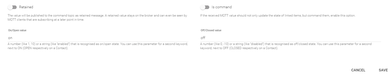 Create a mqtt broker, providing your broker’s data, and create a MQTT Thing. In the MQTT Thing configuration, create a new channel with the followin Data: