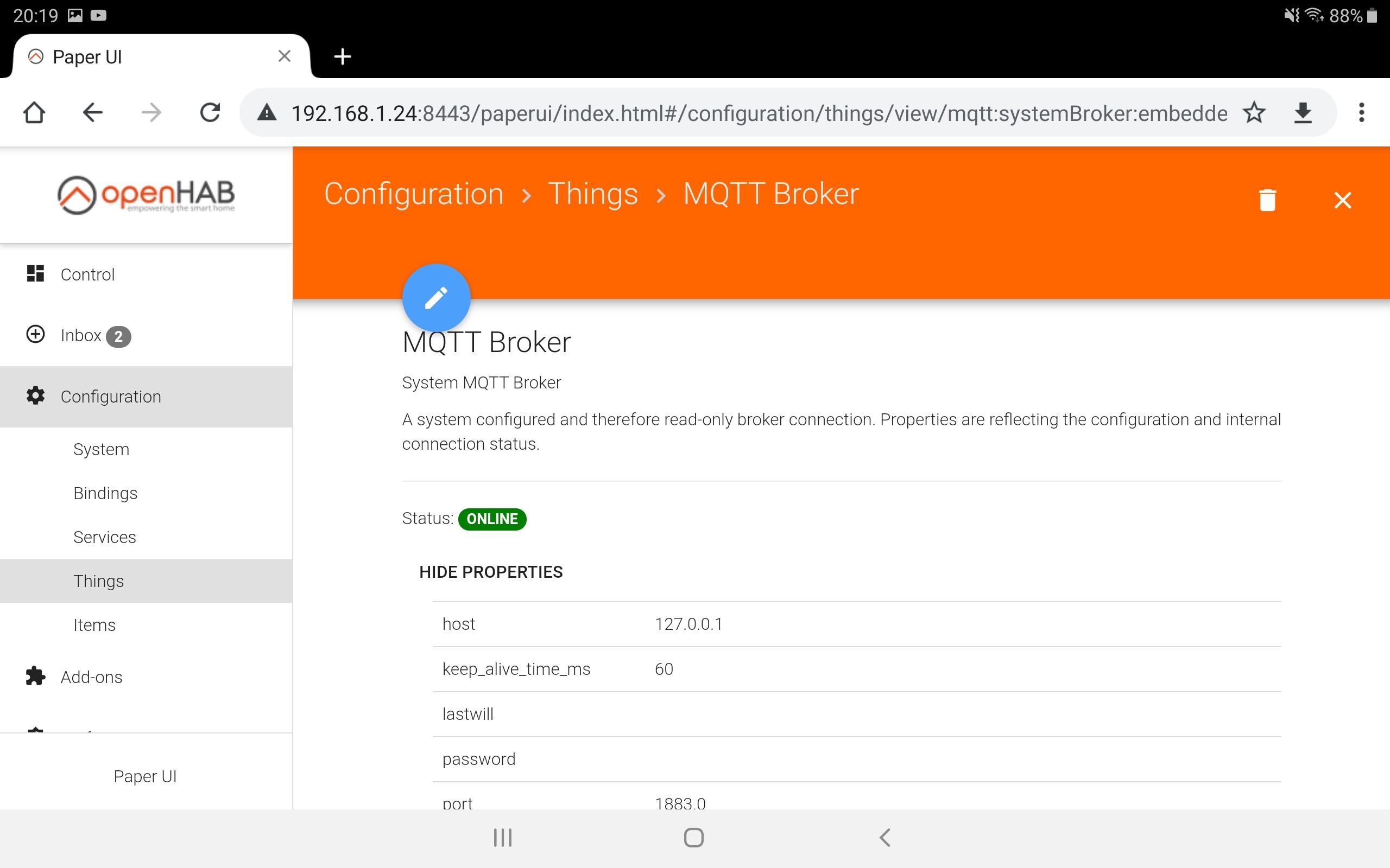 Bridge mqtt:broker:brignoudBroker [ host=“192.168.xx.xx”, secure=false, username=“openhabian”, password=“xxxx” ]