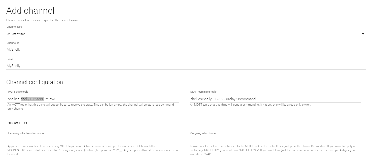 [ stateTopic=“shellies/shelly1-4FFC66/relay/0”, commandTopic=“shellies/shelly1-4FFC66/relay/0/command”]