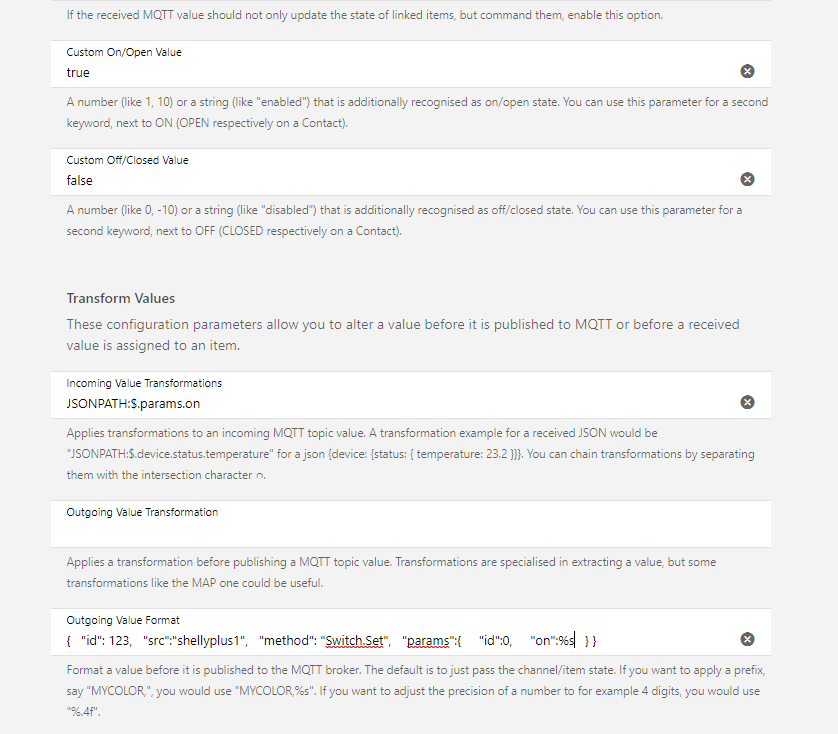 If i toggle my linked item “Test_Betrieb” via OH to true, i can see in the MQTT-Explorer that the message { "method": "Switch.Set", "params": { "id": 0, "on": true } } is published. If i turn the item off, no message is beeing published.