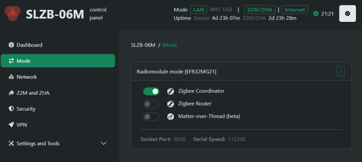 When you have the SLZB-06M connected, first try to access it via your internal network over the web browser. If that works, and hat I have done before auto discovery is to set the stick into ZigBee mode. It will automatically download the required drivers and install them on the stick. This will take 2-3 minutes and it will reboot automatically. After that you will see the zigbee coordinator mode being active.